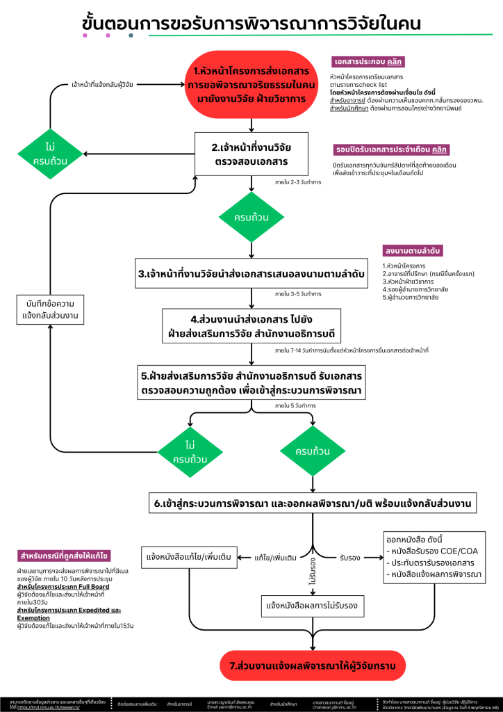 1.กระบวนการพิจารณาจริธรรมการวิจัยในคน ของสำนักงานอธิการบดี ใช้เวลานาน และไม่สามารถเร่งได้ ผู้วิจัยควรเตรียมตัวและเผื่อเวลาในการยื่นขอจนกว่าจะได้รับการรับรองอย่างน้อย 3 เดือน